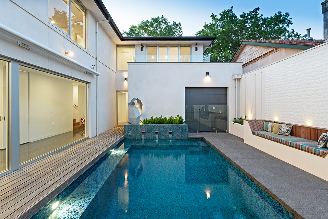 This stunning pool is the perfect example of successfully integrating brand new features within the framework of the existing garden to create a unified look. Taking elements from the previous design to craft a cohesive finish, the black granite paving and pool coping was carefully chosen to complement the dark polished concrete used throughout the home’s ground floor interior and outdoor dining area, to promote a seamless indoor-outdoor flow.