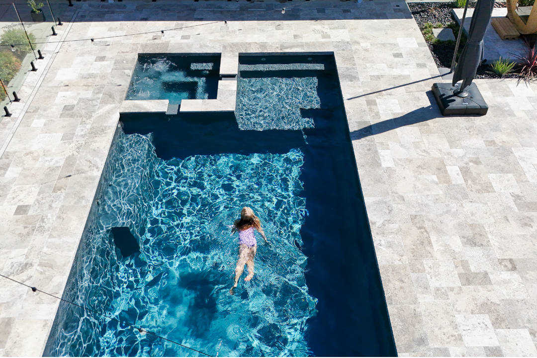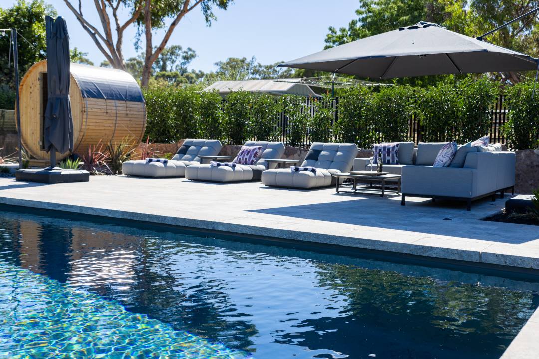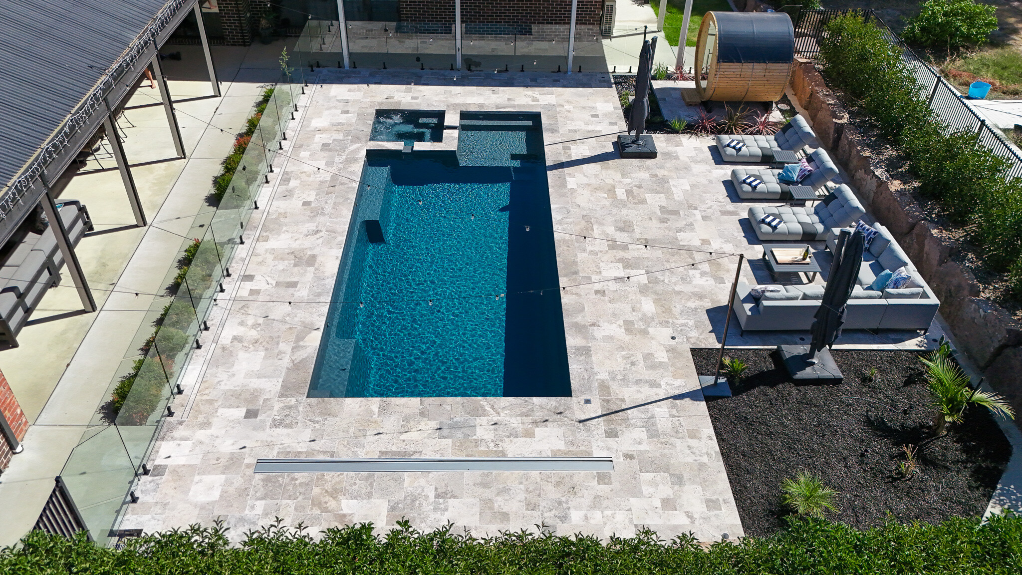 GV Unique Pools & Landscaping were careful to leave a generous amount of space inside the glass and black tubular pool fencing to allow the client to add personal touches, including the sauna pod, sun loungers and ample space for the kids to create a lifetime of memories. The pool area is surrounded by Travertine tiles and copings, with concrete poured in all necessary areas, harmoniously integrating with the surrounding nature. The pool is fitted with an i24 Heat Pump, extra spa jets, stunning pool lights and a Dolphin S300i Pool Cleaner, taking the luxury pool experience to the next level.
