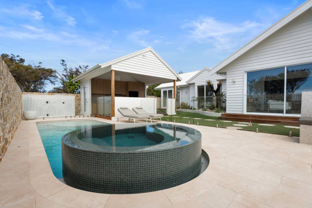 Mesmerising features include an eye-catching infinity edge spa, sun lounge area, premium Bluegum and Luna Wavy ceramic mosaic tiles, the smart integration of a heat pump, an in-floor cleaning system and Halo full automation – all intelligently fitted into a small-scale footprint. Every inch of available space was meticulously maximised – planned to evoke a resort-like atmosphere from the moment you walk in.