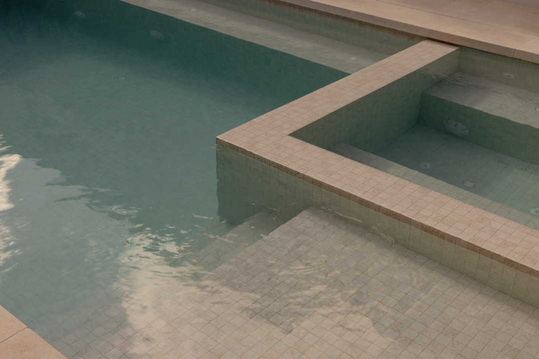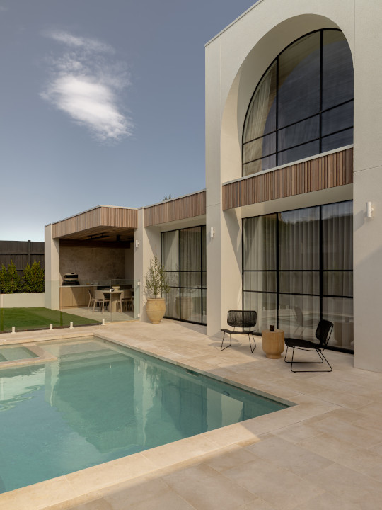 Located for both practicality and visual impact, this tranquil haven enhances the flow of the yard without overwhelming it. Matching travertine tiles were implemented throughout to echo the surrounding paving, creating a seamless and elegant transition from home to outdoor living. With sustainability in mind, solar heating was incorporated to increase energy efficiency and reduce environmental impact. The result is a stunning and harmonious outdoor feature that not only elevates the design of the entire property but also supports modern family living and sustainability goals.
