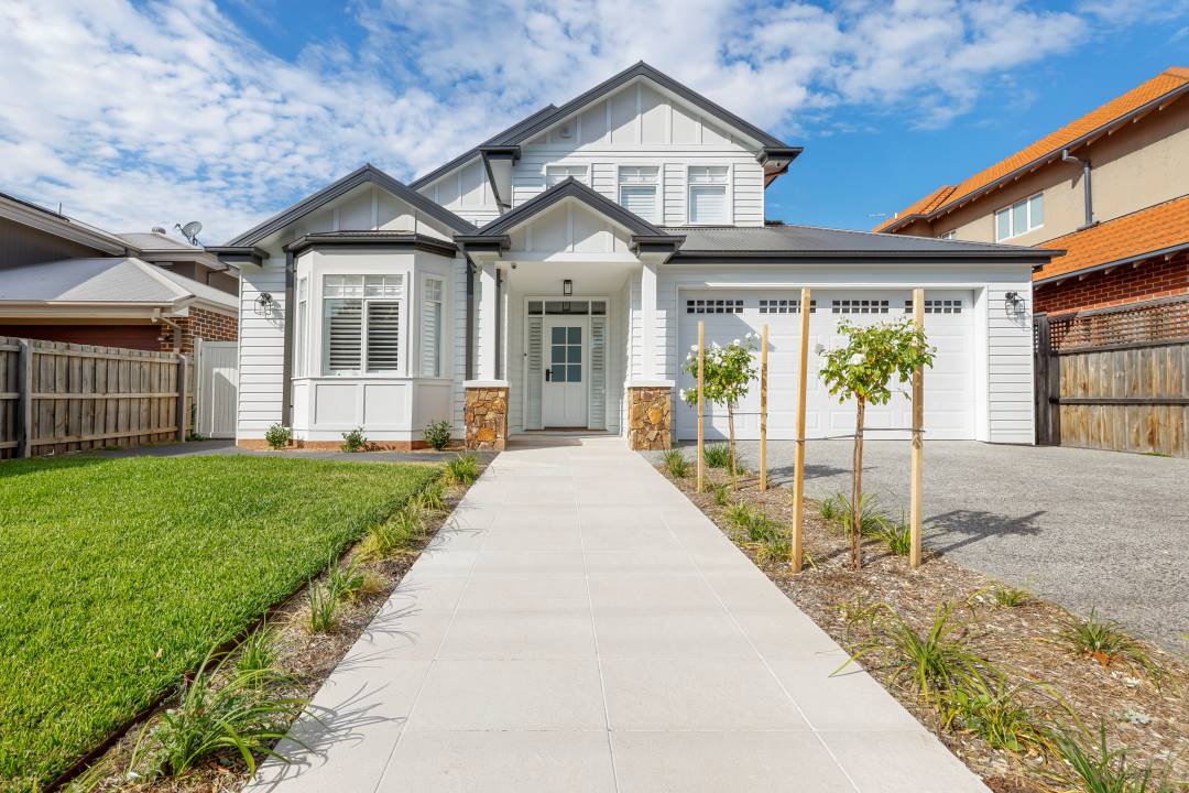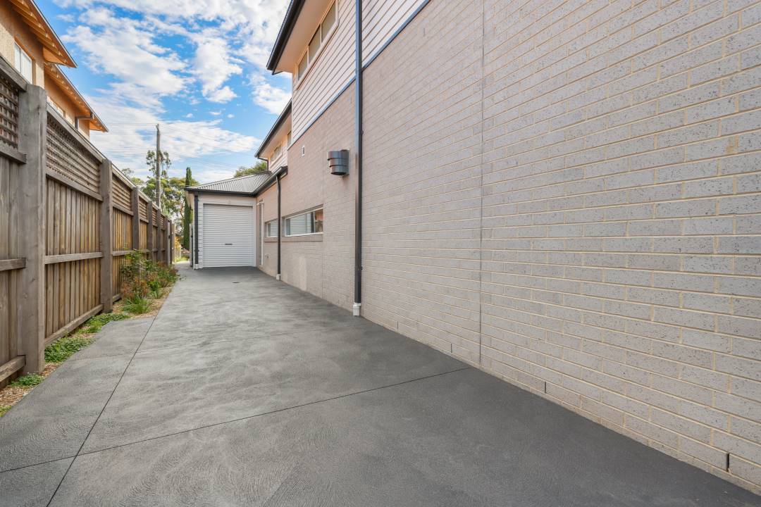 This latest design by The Paver Shop is a stunning addition to the company’s ever-growing portfolio, radiating modern sophistication and timeless appeal. From the first glance, the home impresses with striking street appeal, where large pavers guide a grand and welcoming entrance. The spacious concrete driveway provides a smooth, functional surface for vehicles while seamlessly blending with the minimalist landscaping.