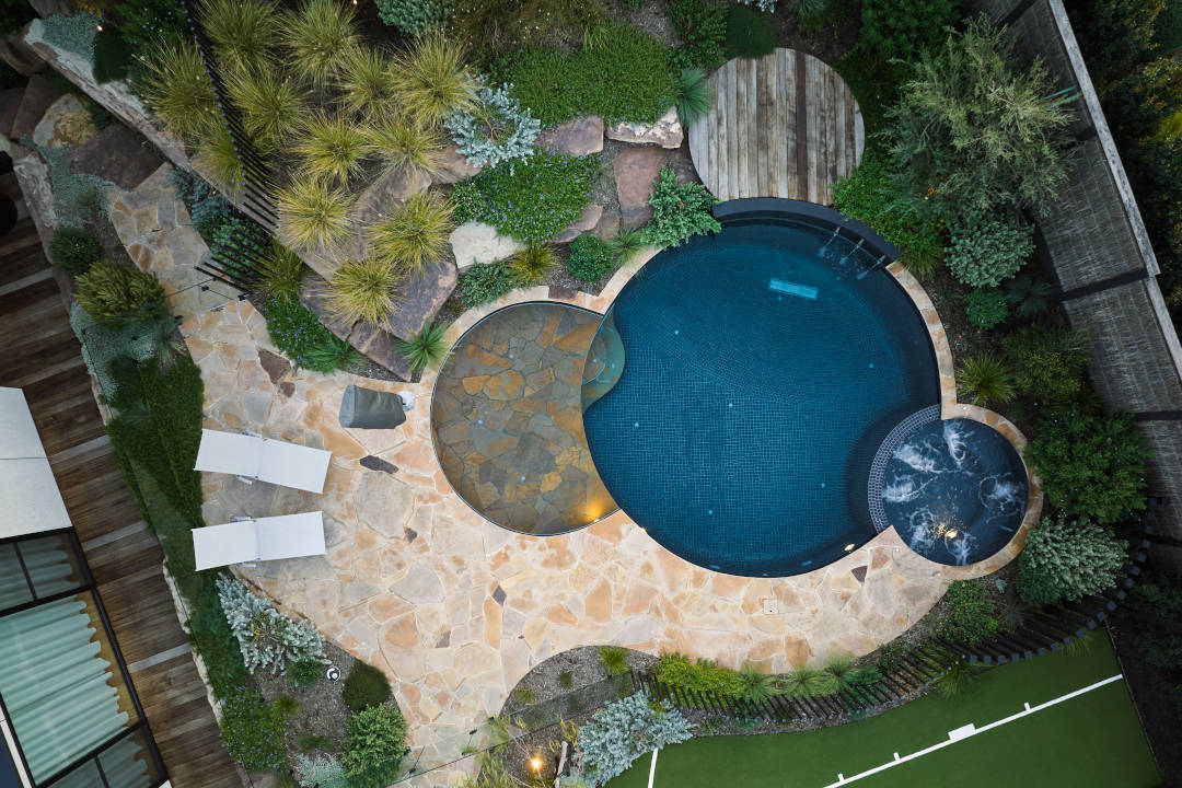 Yarrabee & Castlemaine brought an exceptional eye for detail, combining large mudstone boulders with Castlemaine crazy paving to form natural, earthy hardscapes. These textures contrast beautifully with the dark grey pool tiles, reminiscent of a serene Australian waterhole. The design’s brilliance continues with the paving flowing into the pool’s swim-out and steps, blurring the line between land and water.