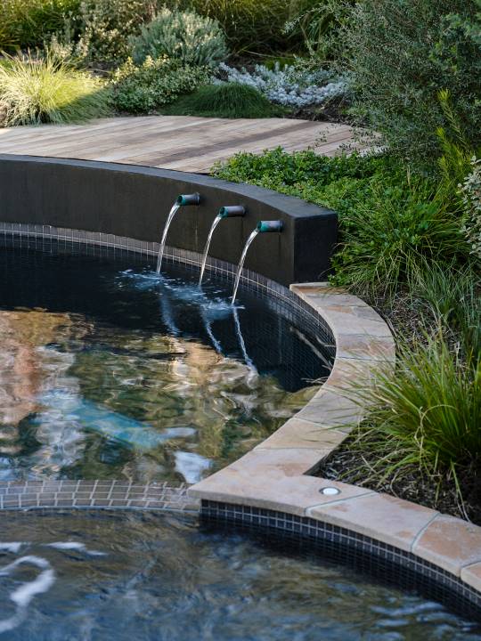 Layers of native plants, iconic to the Mornington Peninsula, wrap the space in a sense of tranquility and place, while custom copper waterspouts bring a dynamic sensory element – introducing gentle movement and sound to this truly immersive, resort-style retreat.